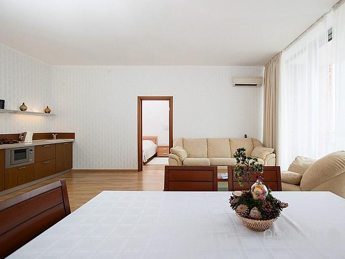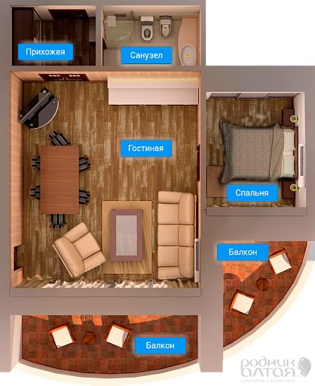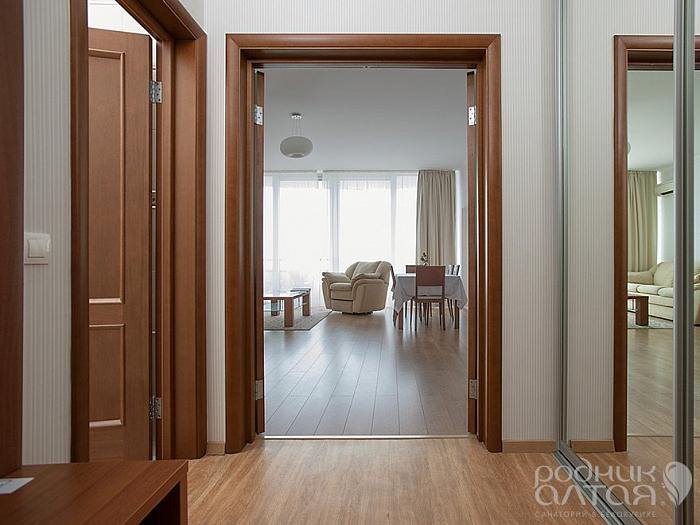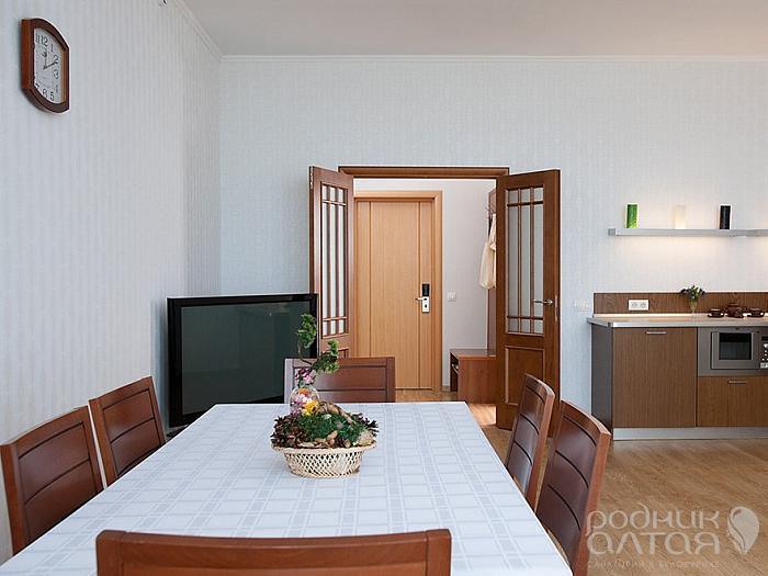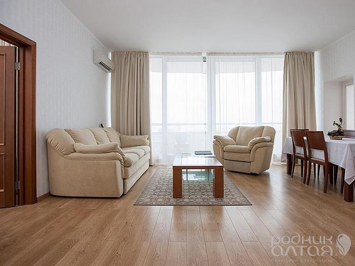 Великолепный номер, состоящий из большой гостиной, совмещенной с кухонной и обеденной зонами, спальни. Всегда есть возможность приготовить и перекусить все, что хочется, а два автономных балкона позволят любоваться видами Белокурихи. Балконы оборудованы уютными креслами и столиками. В номере комфортно размещаются 4 человека: 2 гостей - на широкой двуспальной кровати, и еще двое - на раскладном диване. Для гостей с маленькими детьми возможно размещение в номере детской кроватки или дополнительного мобильного спального места. Корпус: «Здравница» Вид из окна: комплекс летних бассейнов / на город Тип кровати: дабл (2-спальная кровать) Число основных мест: 2 Число дополнительных мест: 2 + 1 мобильное Возможность установки детской кроватки: да Дополнительные преимущества проживания в номерах повышенной комфортности: Питание в ресторане (трехразовое по заказному меню с элементами шведского стола). Родниковая вода пополняется ежедневно по мере расходования. Белые махровые халаты и тапочки. Бесплатные услуги прачечной. Бесплатные услуги по глажению одежды. Ежедневное бесплатное посещение внутреннего бассейна с зоной отдыха с предоставлением напитков (время посещения назначается в санатории). При заезде на номер комплимент с ежедневным пополнением: мед Алтайский, чай травяной, тростниковый сахар, чай пакетированный черный и зеленый, кофе растворимый. Дополнительное оборудование (обогреватель, ортопедическую подушку, детская кроватку, детскую ванночку и мн.др.) можно заказать бесплатно по бланку «Лист пожеланий», который есть в каждом номере санатория.
