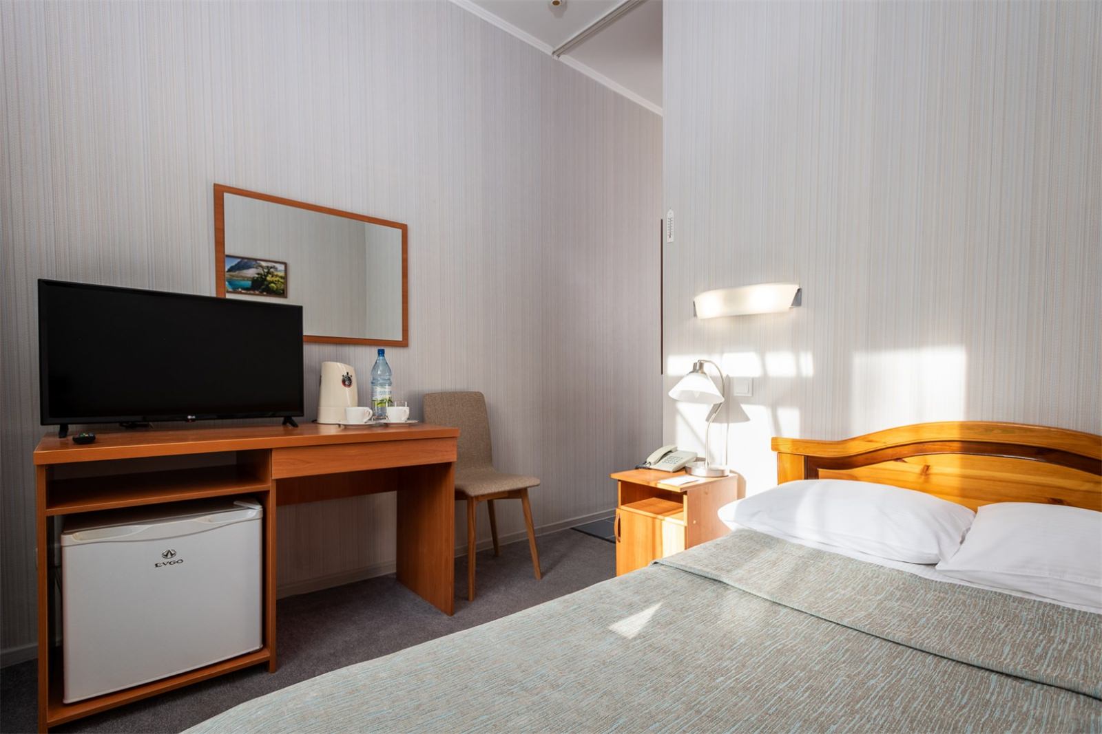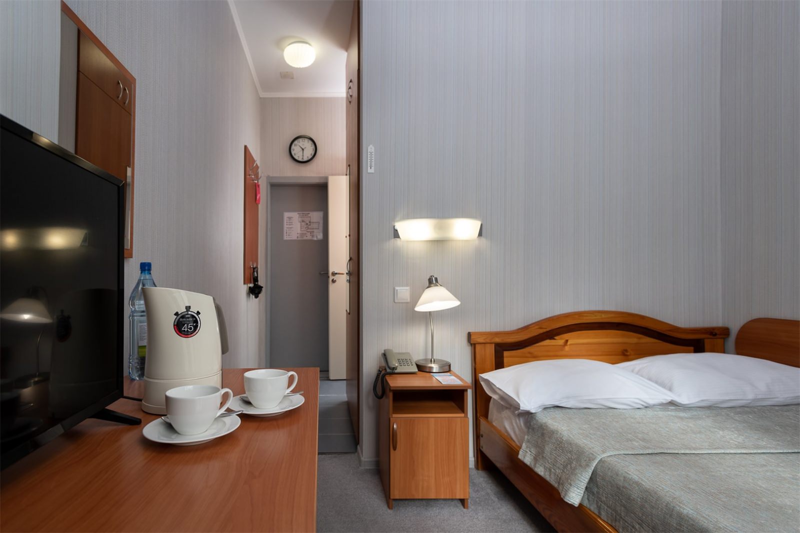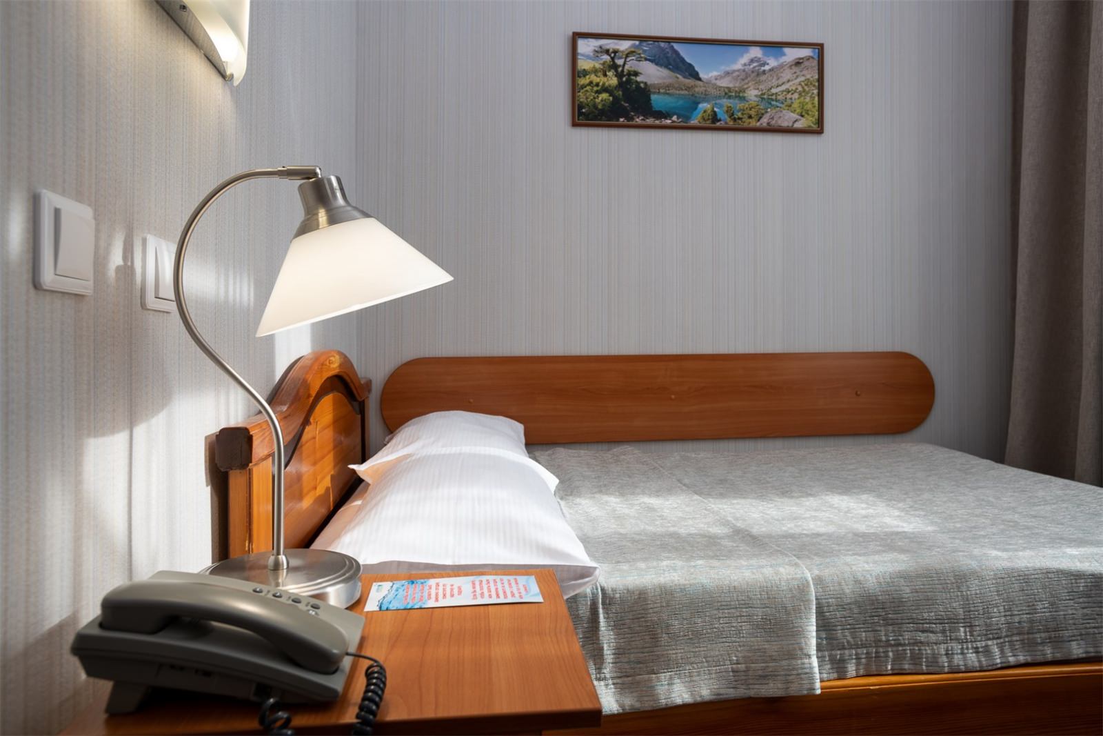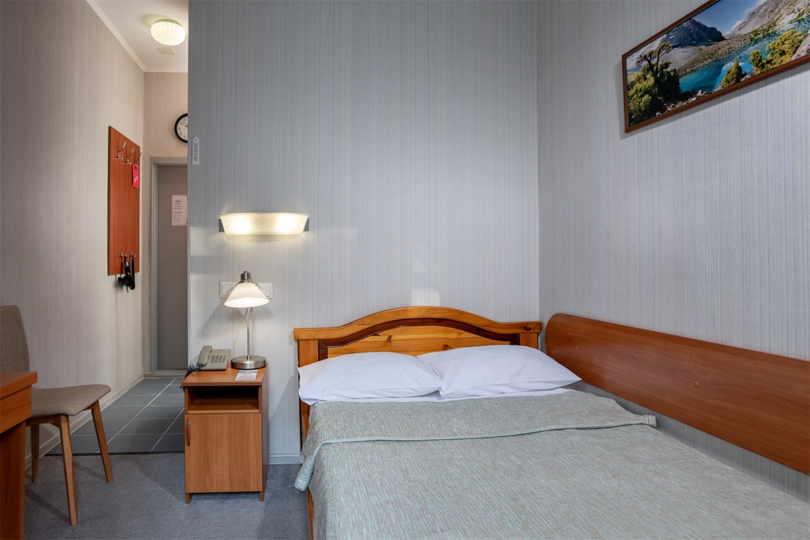 Небольшой, уютный одноместный номер с 1 кроватью 120*200 см. Отлично подойдет гостям, предпочитающим отдых наедине с собой. Корпус: «Родник» Вид из окна: на лес Тип кровати: дабл (одна 1,5 кровать) Число основных мест: 1 Число дополнительных мест: нет Возможность установки детской кроватки: нет Дополнительное оборудование (обогреватель, ортопедическую подушку, детская кроватку, детскую ванночку и мн.др.) можно заказать бесплатно по бланку «Лист пожеланий», который есть в каждом номере санатория. В свободном доступе в бытовой комнате любого корпуса: стиральная машина, гладильные доски и утюги. На ресепшен - индивидуальные ячейки для хранения.