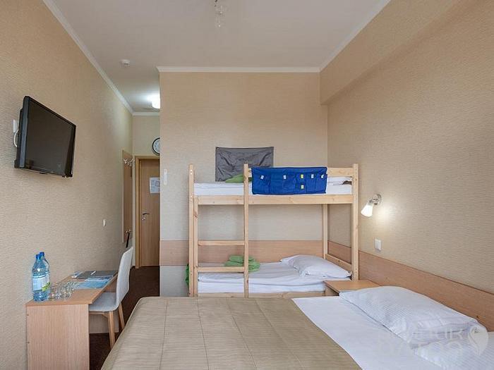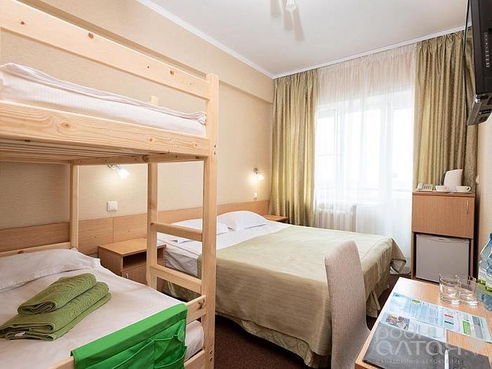 Небольшой, уютный номер с балконом. В номере комфортно размещаются 2 взрослых на двуспальной кровати 160*200 (или 2 сдвинутые кровати 180*200 см) и 2 ребенка на двухъярусной. Корпус: «Здравница» Вид из окна: на лес или на город или на летние бассейны Тип кровати: дабл (2-спальная кровать или 2 сдвинутые кровати) Число основных мест: 2 Число дополнительных мест: 2 Возможность установки детской кроватки: нет