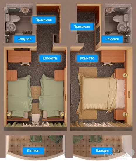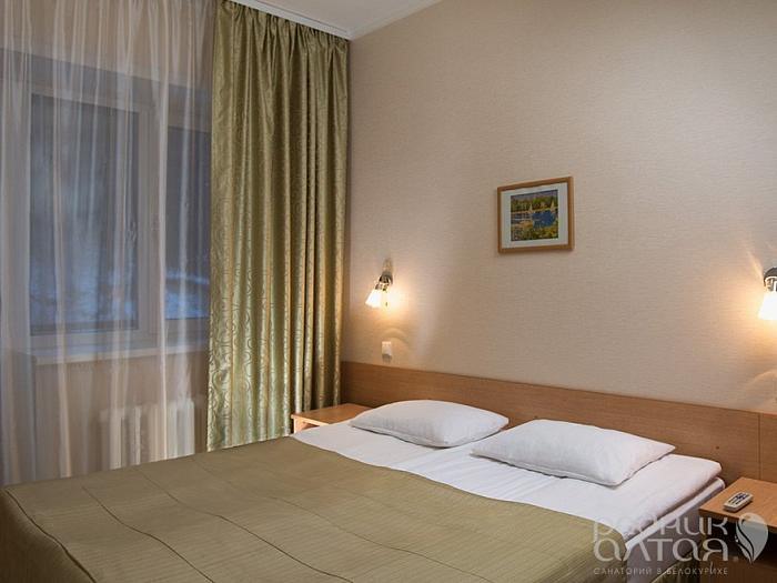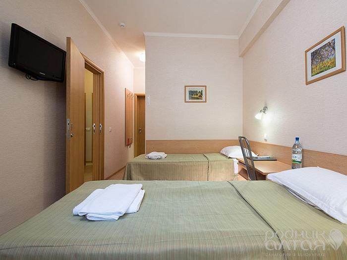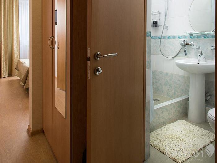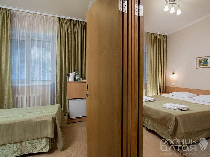Четырехместный стандарт семейный - это два полноценных двухместных номера, которые соединены между собой дверью. В каждом номере свой сан. узел и балкон. В одном номере двуспальная кровать, в другом – две односпальных кровати. В номере комфортно разместятся 4 человека: 2 гостя на одной двуспальной кровати в одной комнате и еще двое гостей на двух односпальных кроватях в соседней комнате. Для гостей с маленькими детьми возможно размещение детской кроватки в номере или дополнительного мобильного спального места. Корпус: «Здравница» Вид из окна: на лес или на город Тип кровати: твин (две раздельные кровати) и дабл (2-спальная кровать) Число основных мест: 4 Число дополнительных мест: 0 + 1 мобильное Возможность установки детской кроватки: да Дополнительное оборудование (обогреватель, ортопедическую подушку, детская кроватку, детскую ванночку и мн.др.) можно заказать бесплатно по бланку «Лист пожеланий», который есть в каждом номере санатория. В свободном доступе в бытовой комнате любого корпуса: стиральная машина, гладильные доски и утюги. На ресепшен - индивидуальные ячейки для хранения.